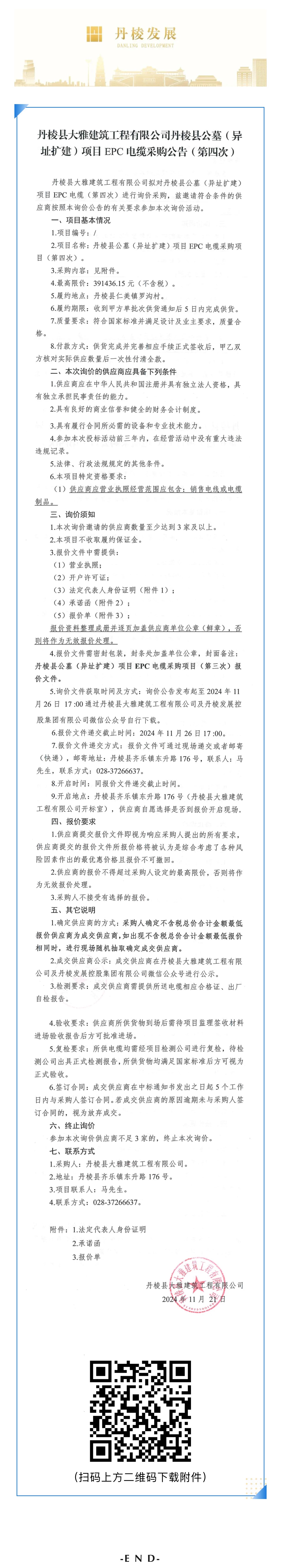 丹棱縣大雅建筑工程有限公司丹棱縣公墓(異址擴(kuò)建)項(xiàng)目EPC電纜采購(gòu)公告(第四次)