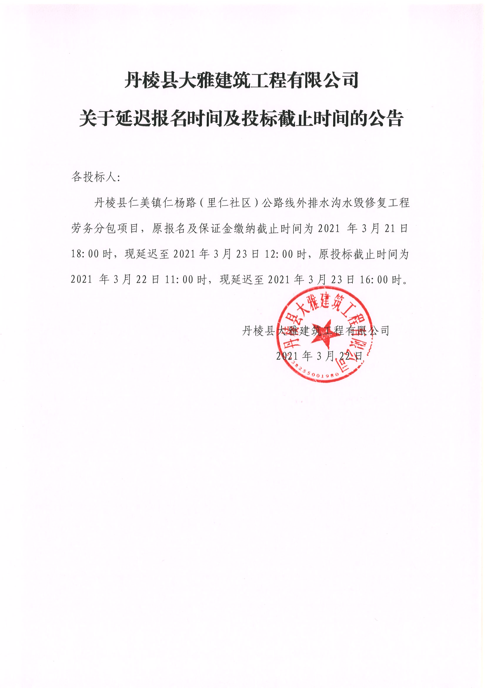 【大雅建筑公司】丹棱縣仁美鎮(zhèn)仁楊路(里仁社區(qū))公路線外排水溝水毀修復(fù)工程勞務(wù)分包關(guān)于延遲報(bào)名時(shí)間及投標(biāo)截止時(shí)間的公告