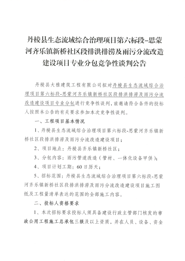 【大雅建筑公司】丹棱縣生態(tài)流域綜合治理項(xiàng)目第六標(biāo)段-思蒙河齊樂(lè)鎮(zhèn)新橋社區(qū)段排洪排澇及雨污分流改造建設(shè)項(xiàng)目專(zhuān)業(yè)分包競(jìng)爭(zhēng)性談判公告