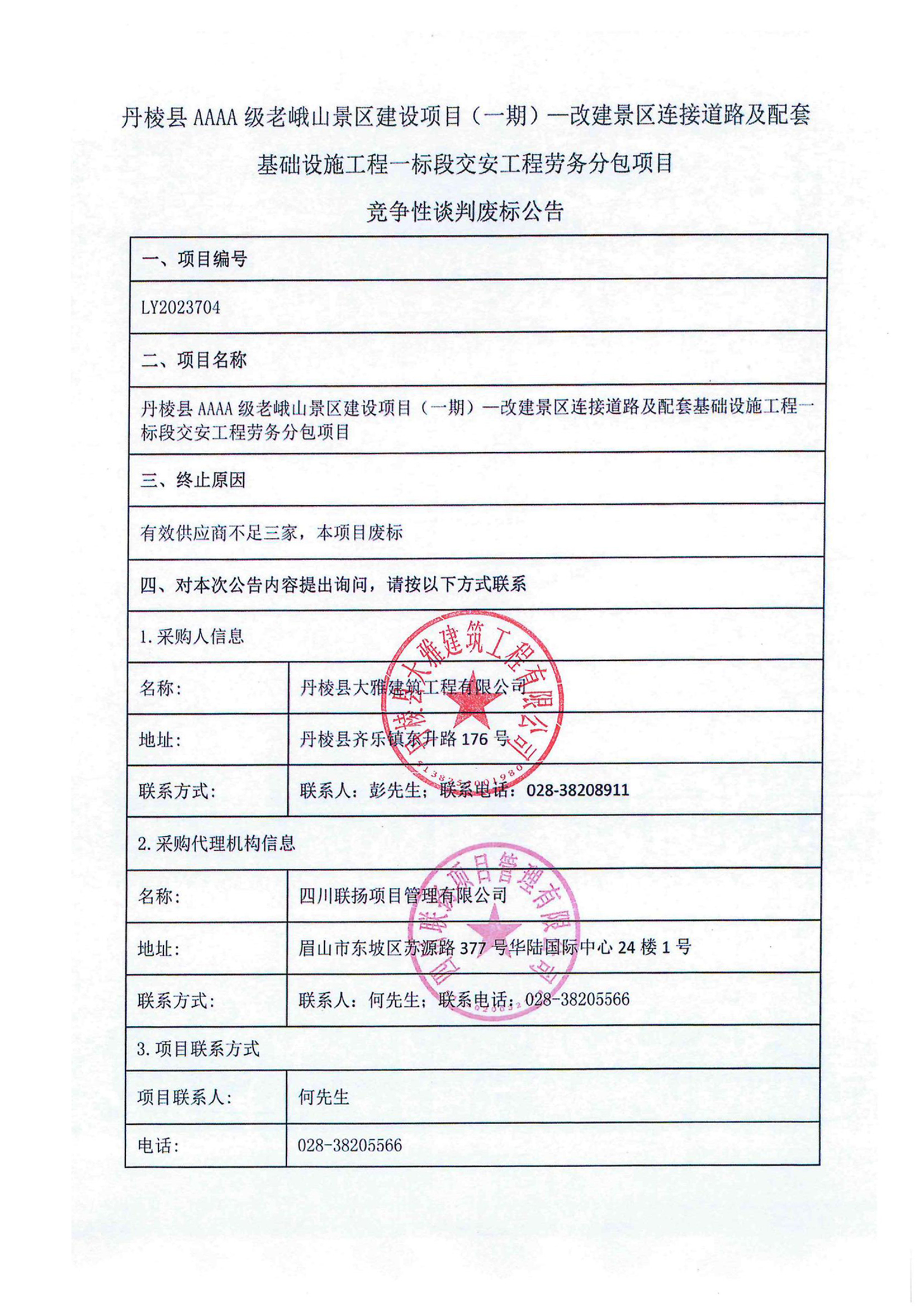 丹棱縣AAAA級老峨山景區(qū)建設(shè)項(xiàng)目(一期)一改建景區(qū)連接道路及配套基礎(chǔ)設(shè)施工程一標(biāo)段交安工程勞務(wù)分包項(xiàng)目競爭性談判廢標(biāo)公告