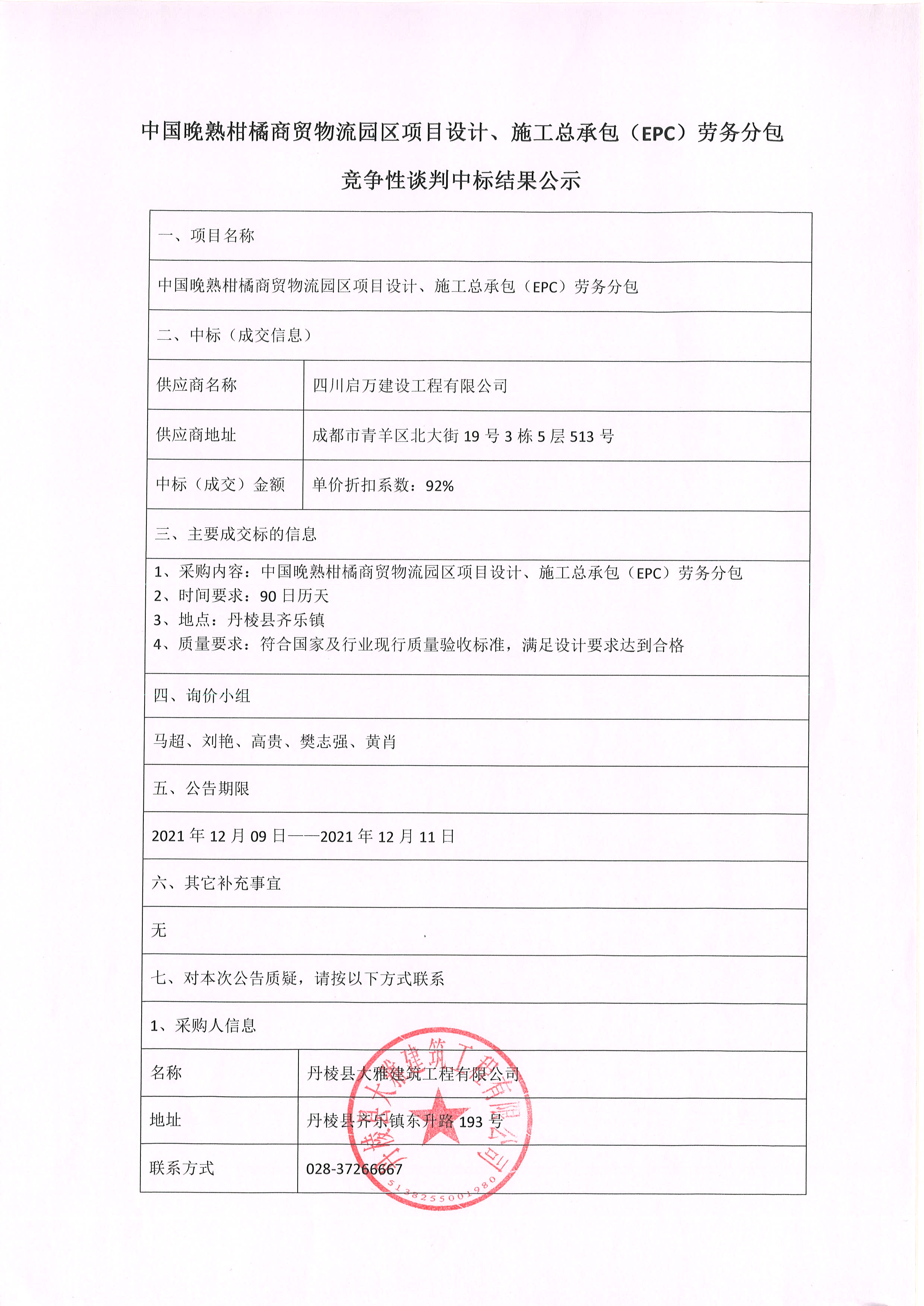 【大雅建筑公司】中國晚熟柑橘商貿(mào)物流園區(qū)項目設(shè)計、施工總承包(EPC)勞務分包競爭性談判中標結(jié)果公示
