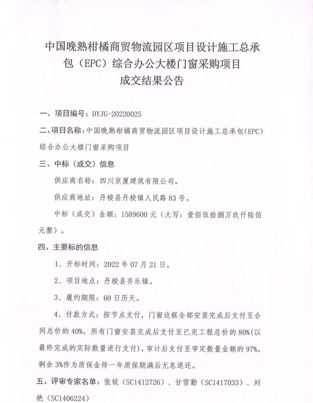 中國(guó)晚熟柑橘商貿(mào)物流園區(qū)項(xiàng)目設(shè)計(jì)施工總承包(EPC)綜合辦公大樓門窗采購(gòu)項(xiàng)目成交結(jié)果公告