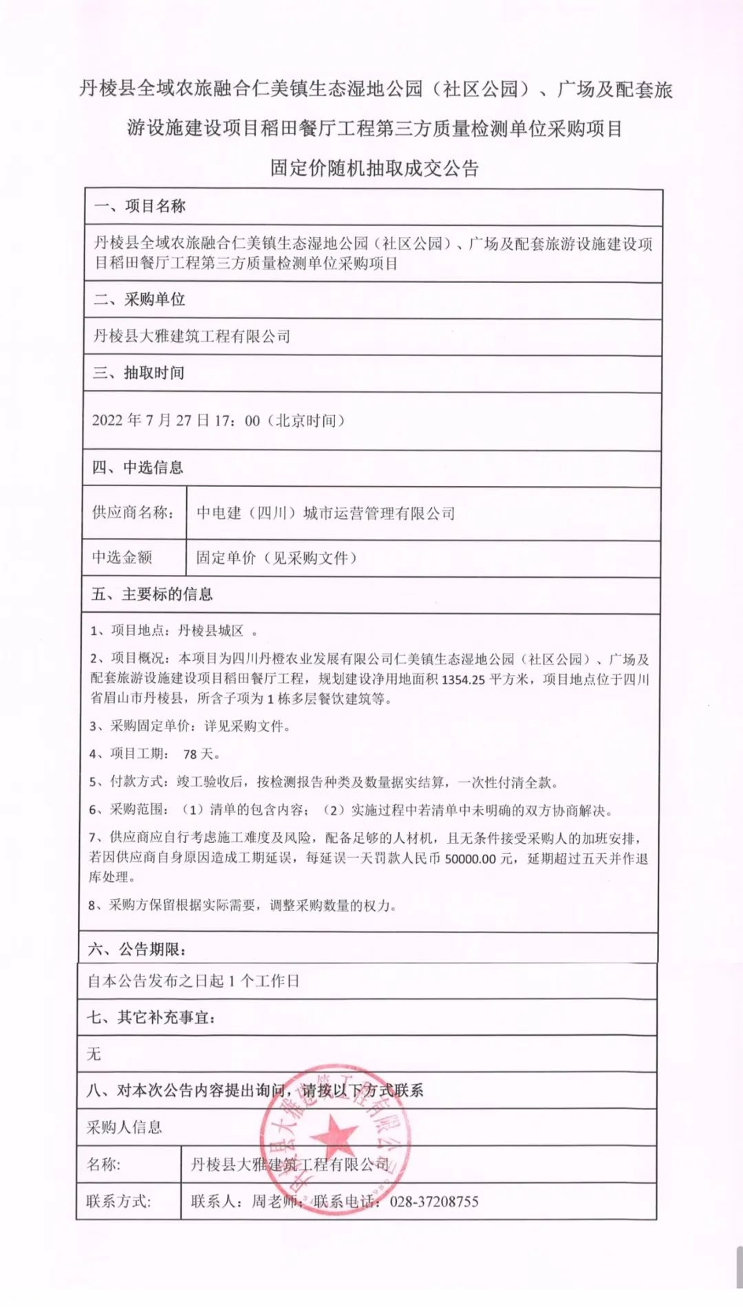 仁美鎮(zhèn)生態(tài)濕地公園(社區(qū)公園)、廣場及配套旅游設(shè)施建設(shè)項(xiàng)目稻田餐廳工程第三方質(zhì)量檢測單位采購項(xiàng)目固定價隨機(jī)抽取成交公告
