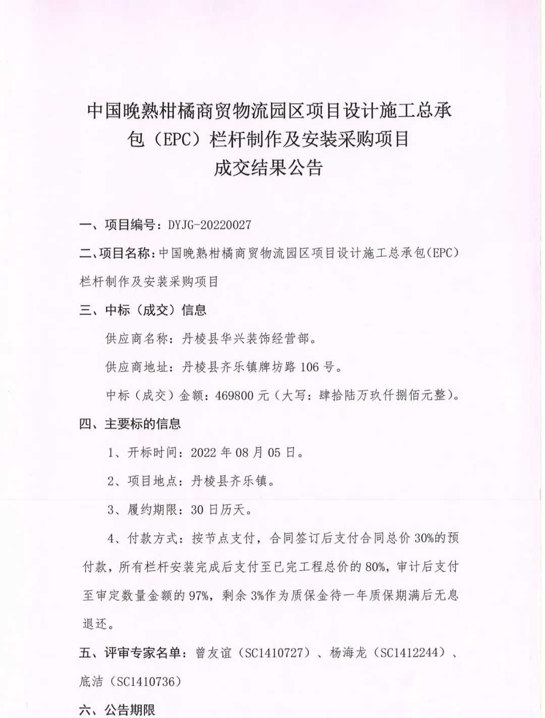 中國(guó)晚熟柑橘商貿(mào)物流園區(qū)項(xiàng)目設(shè)計(jì)施工總承包(EPC)欄桿制作及安裝采購(gòu)項(xiàng)目成交結(jié)果公告