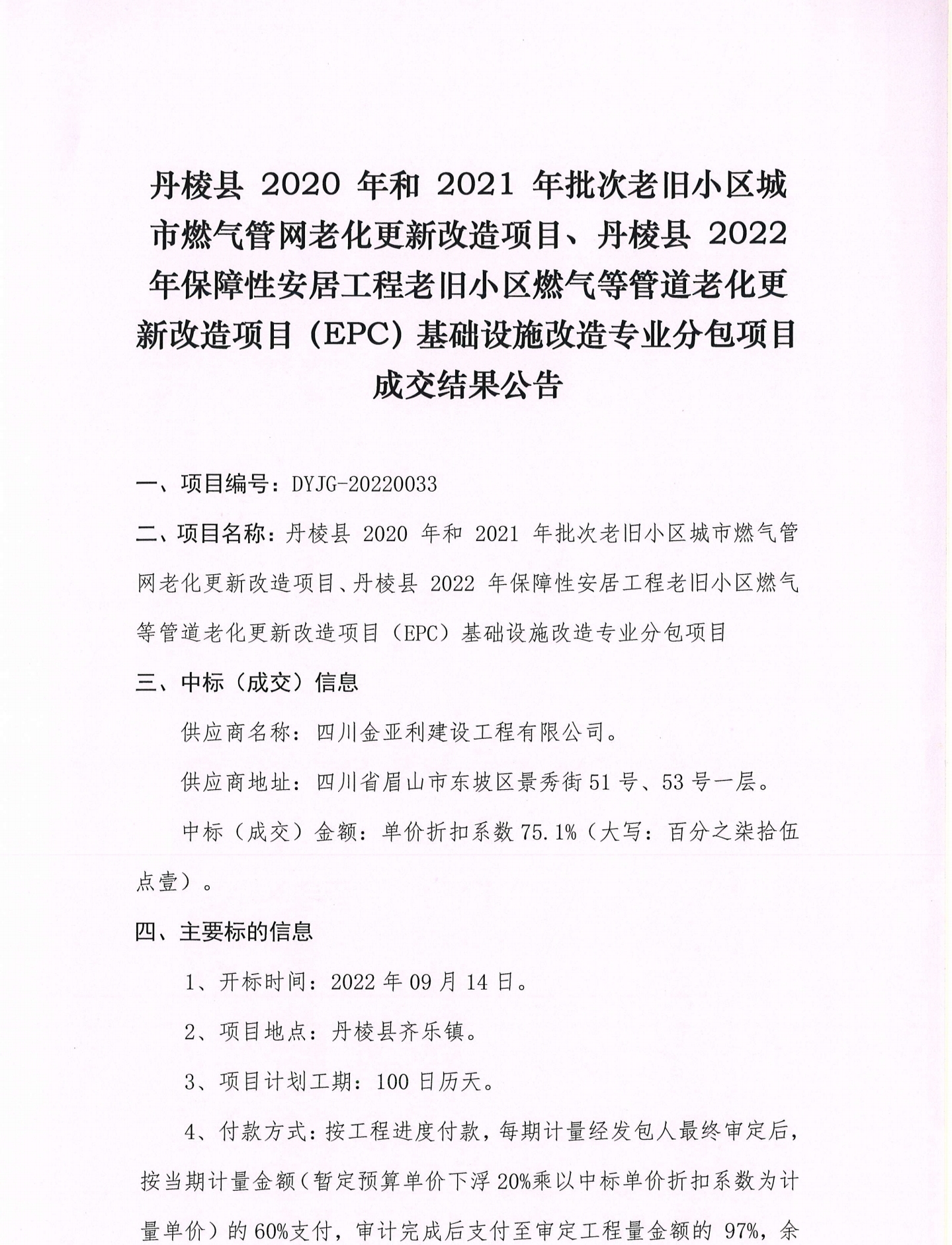 丹棱縣2020年和2021年批次老舊小區(qū)城市燃?xì)夤芫W(wǎng)老化更新改造項(xiàng)目、丹棱縣2022年保障性安居工程老舊小區(qū)燃?xì)獾裙艿览匣赂脑祉?xiàng)目(EPC)基礎(chǔ)設(shè)施改造專業(yè)分包項(xiàng)目 成交結(jié)果公告