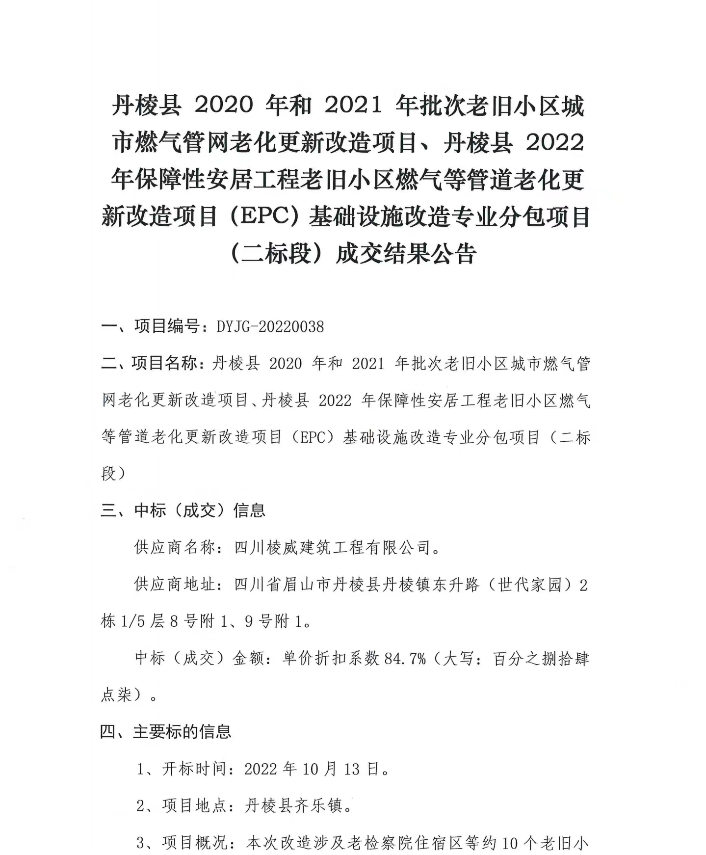 丹棱縣2020年、2021年和2022年老舊小區(qū)城市燃氣管網(wǎng)老化更新改造項目基礎設施改造專業(yè)分包項目(二標段)成交結果公告