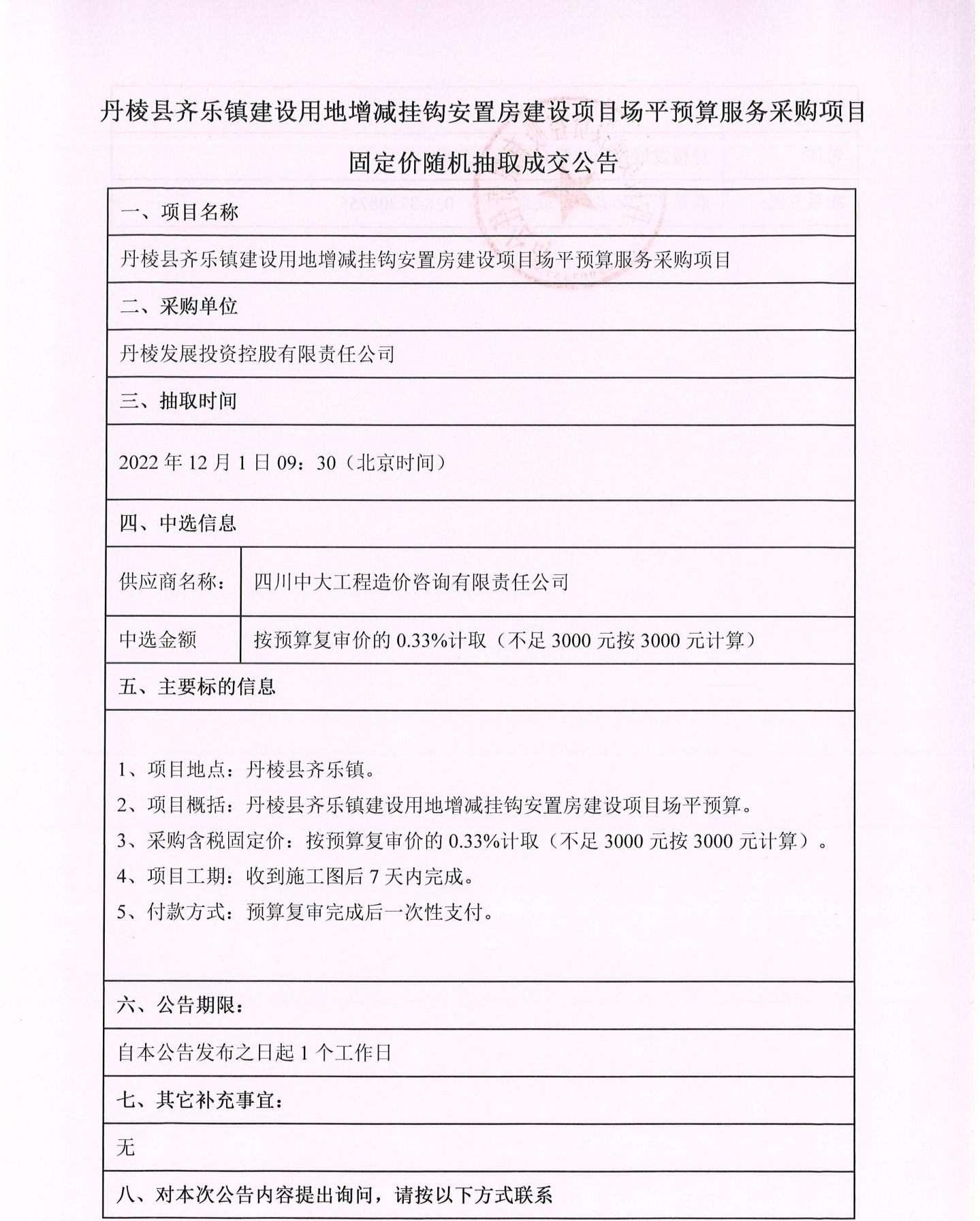 丹棱縣齊樂鎮(zhèn)建設(shè)用地增減掛鉤安置房建設(shè)項(xiàng)目場平預(yù)算服務(wù)采購項(xiàng)目固定價隨機(jī)抽取成交公告