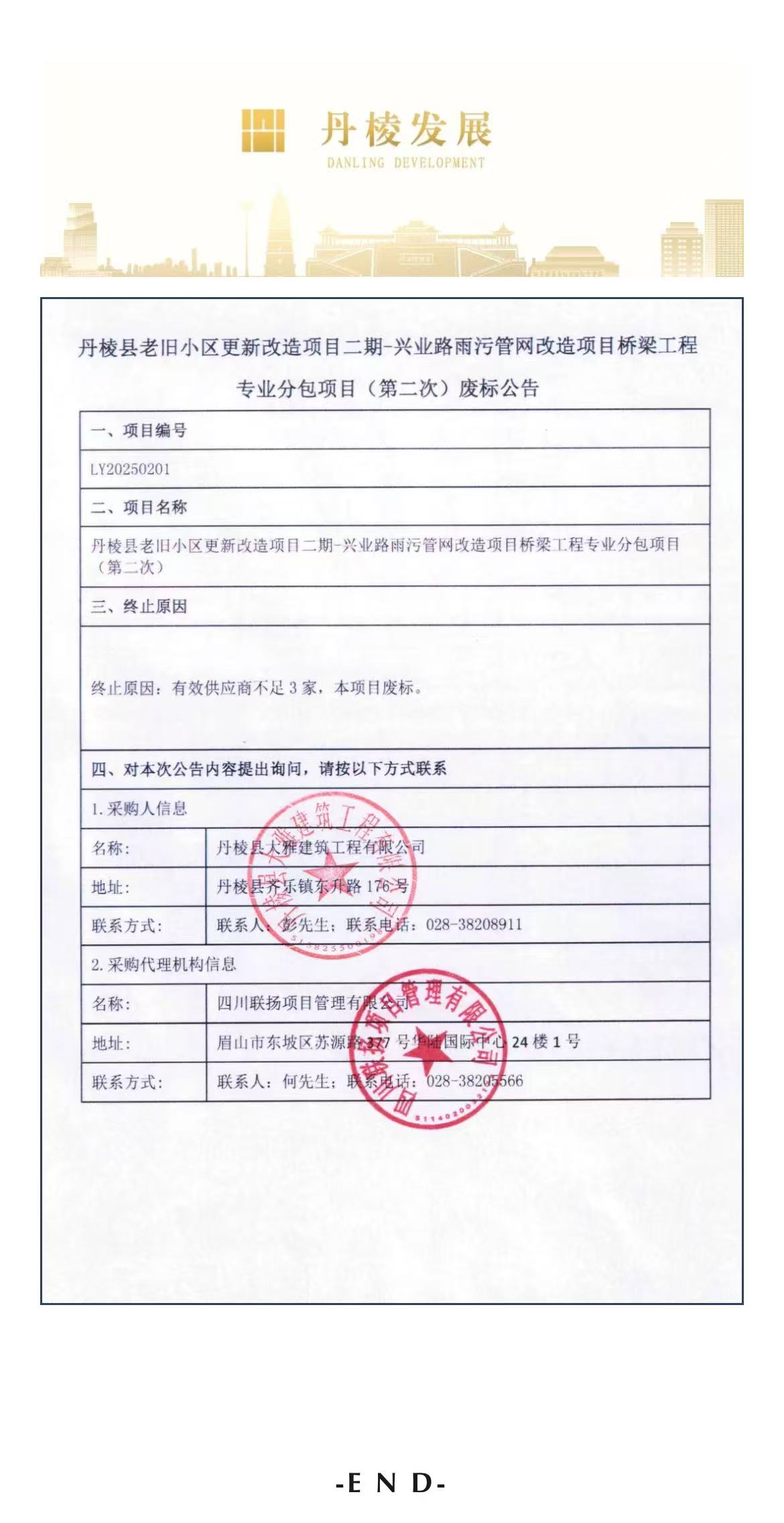 丹棱縣老舊小區(qū)更新改造項(xiàng)目二期-興業(yè)路雨污管網(wǎng)改造項(xiàng)目橋梁工程專業(yè)分包項(xiàng)目(第二次)廢標(biāo)公告