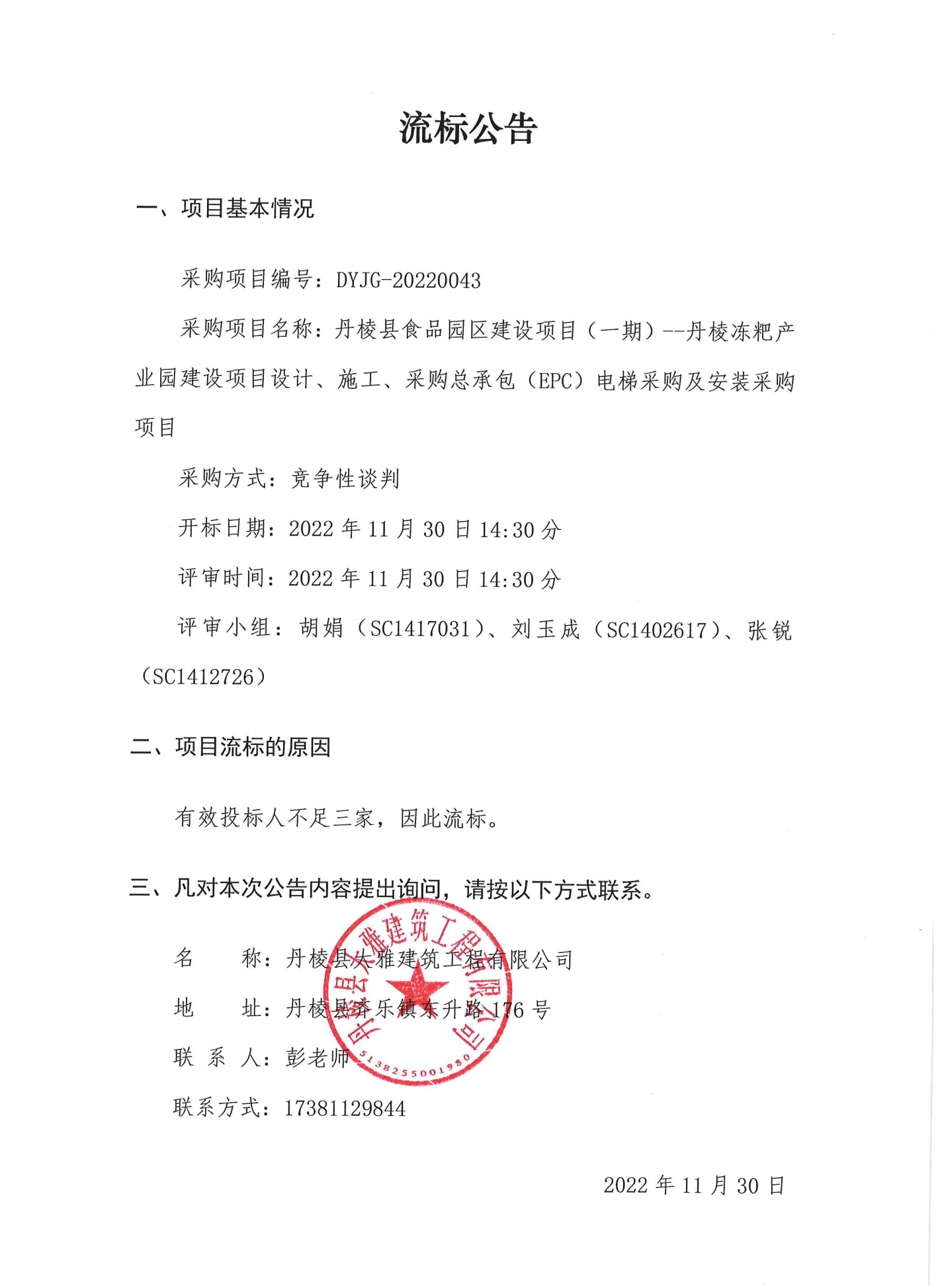 丹棱縣食品園區(qū)建設(shè)項(xiàng)目 (一期)--丹棱凍粑產(chǎn)業(yè)園建設(shè)項(xiàng)目設(shè)計、施工、采購總承包 (EPC) 電梯采購及安裝采購項(xiàng)目流標(biāo)公告