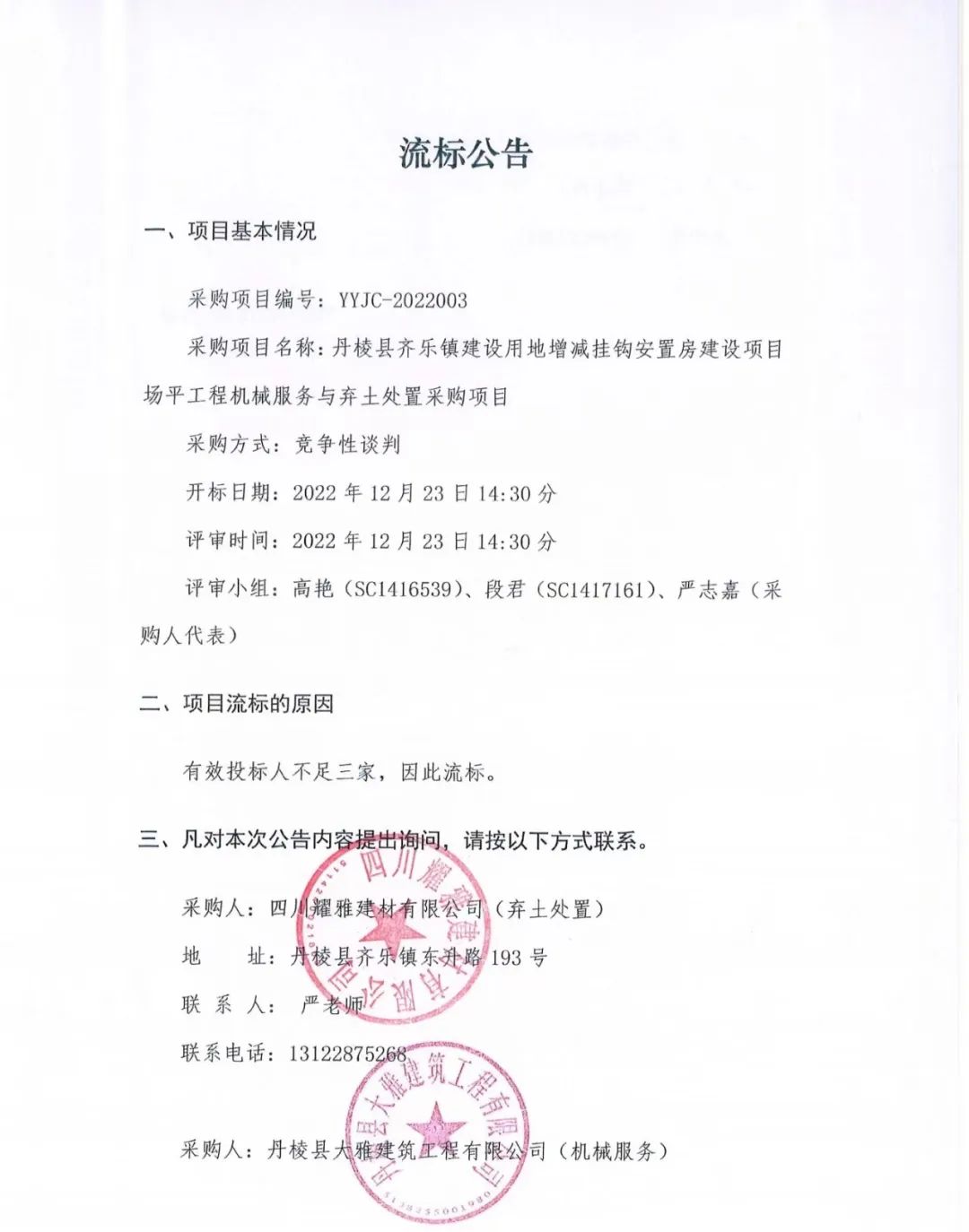 丹棱縣齊樂鎮(zhèn)建設(shè)用地增減掛鉤安置房建設(shè)項(xiàng)目場(chǎng)平工程機(jī)械服務(wù)與棄土處置采購(gòu)項(xiàng)目流標(biāo)公告