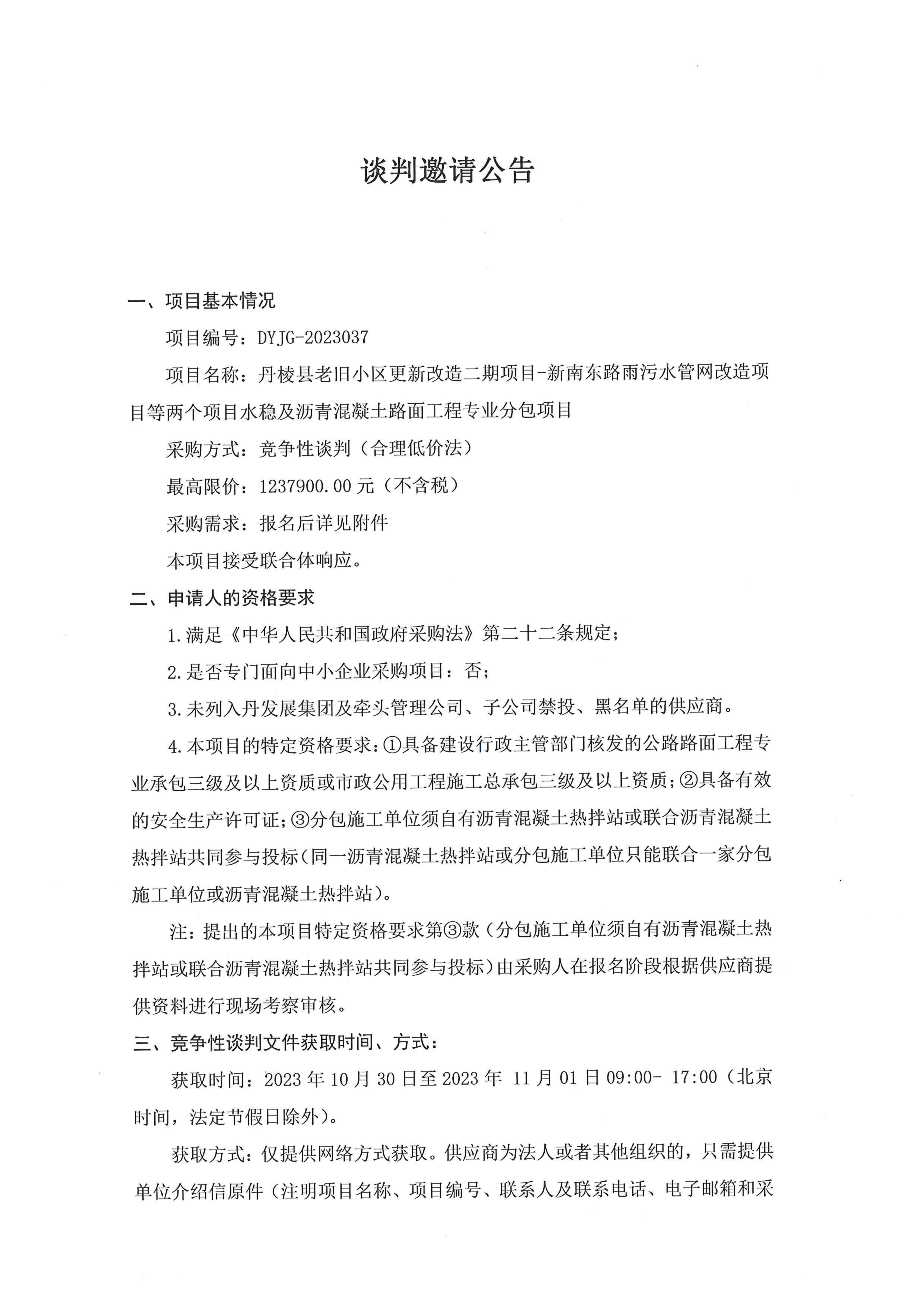 丹棱縣老舊小區(qū)更新改造二期項(xiàng)目-新南東路雨污水管網(wǎng)改造項(xiàng)目等兩個項(xiàng)目水穩(wěn)及瀝青混凝土路面工程專業(yè)分包項(xiàng)目談判邀請公告